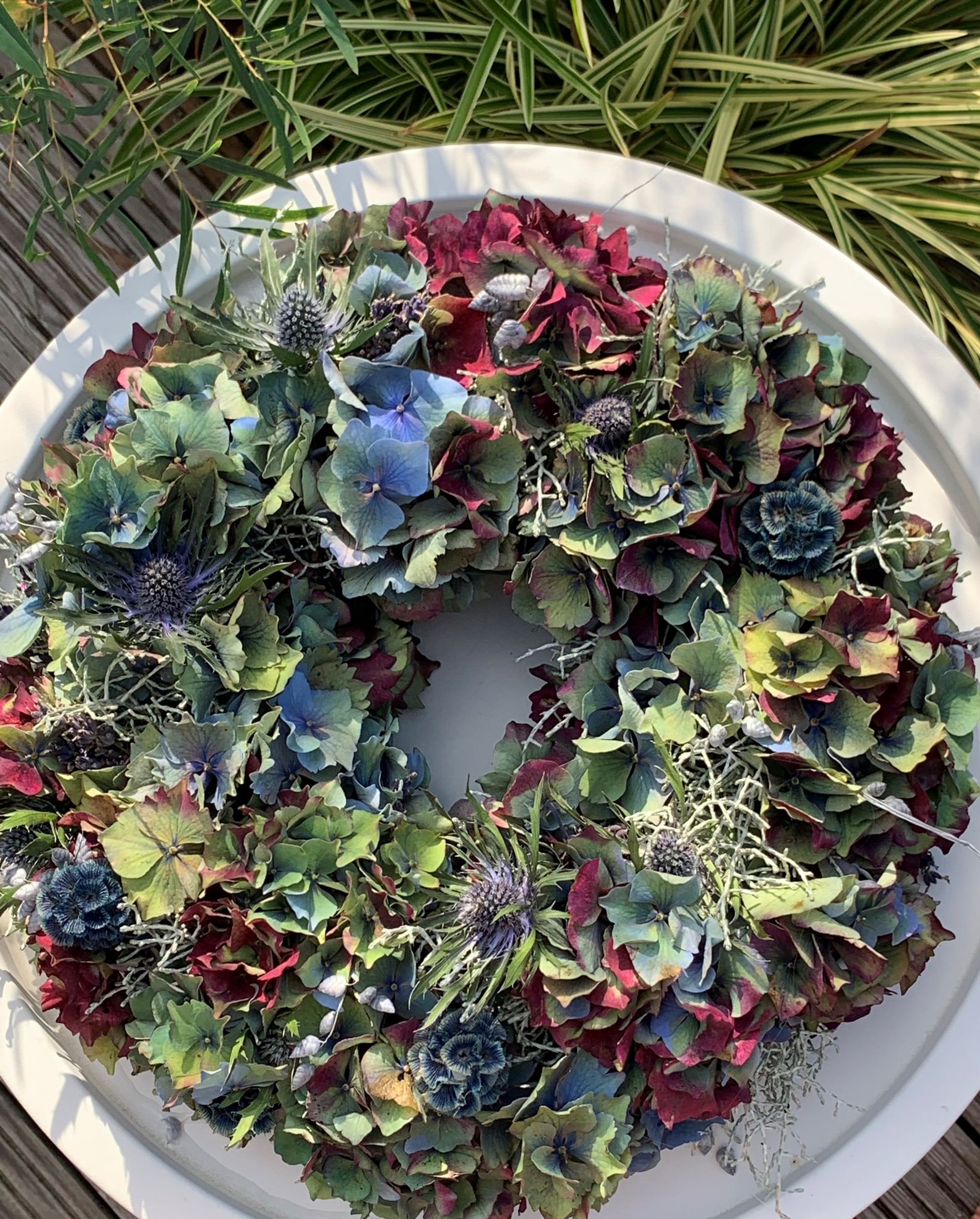 Kränze gibt es für alle Jahreszeiten. Der Frühling besticht durch Zweige und Moos. Der Sommer bietet eine große Auswahl an floralen Materialien. Und was wäre der Herbst ohne Hortensien und Hagebutten? Abgerundet wird das Jahr mit dem traditionellen Adventskranz.